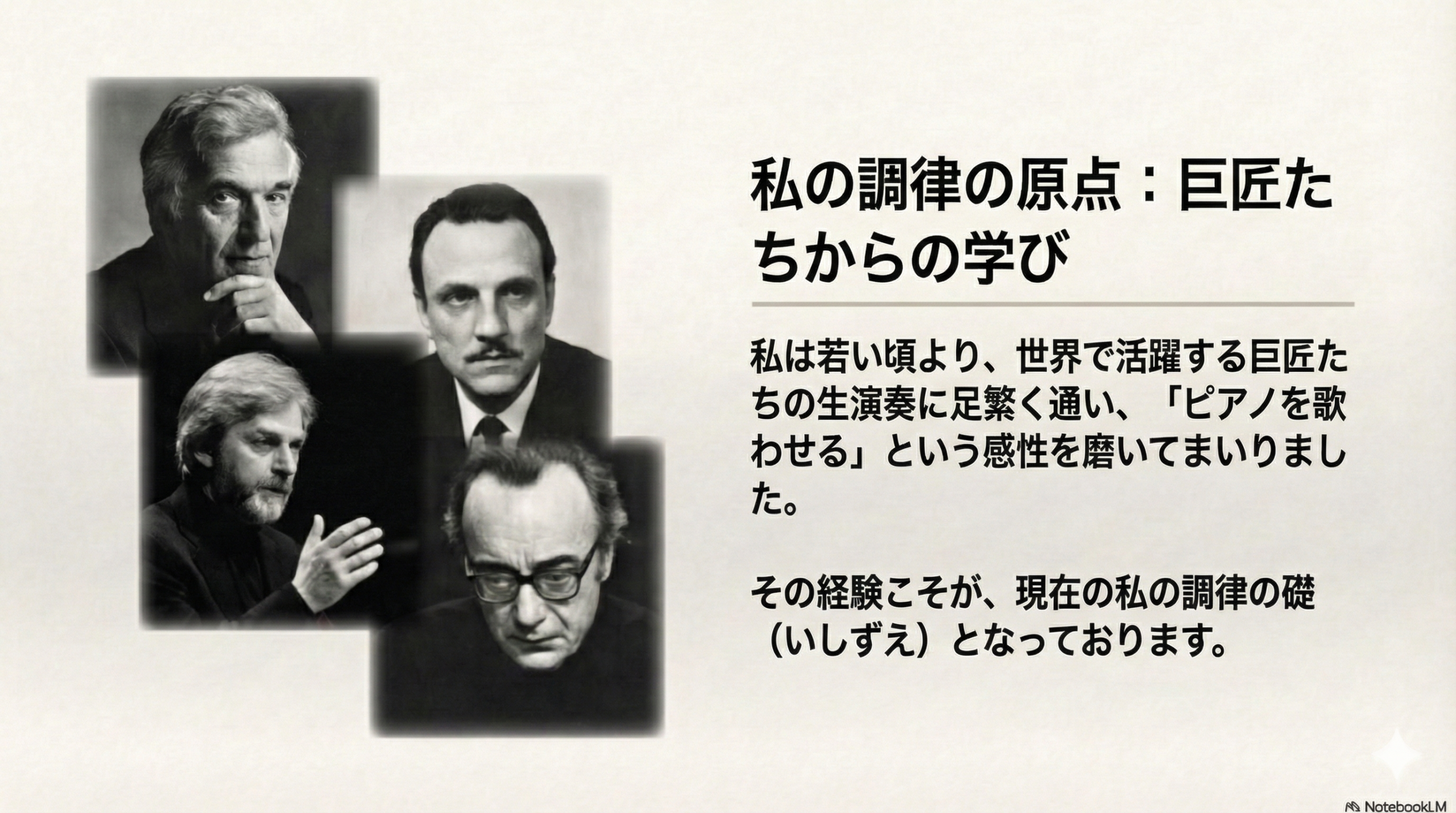 ピアノを歌わせるためには、リサイタルで巨匠の音から学べ。感性を磨く必要がある。