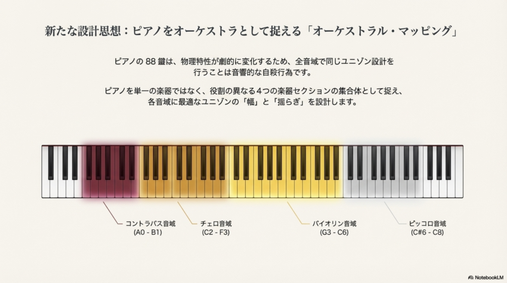 ピアノ鍵盤にオーケストラマッピングすると、どのようなイメージの調律が最適なのかヒントになる♫
