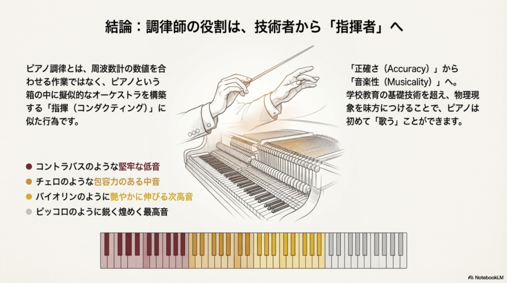 ピアノを歌わせるには、調律師はピアノ内疑似オーケストラの指揮者的な仕事が必要