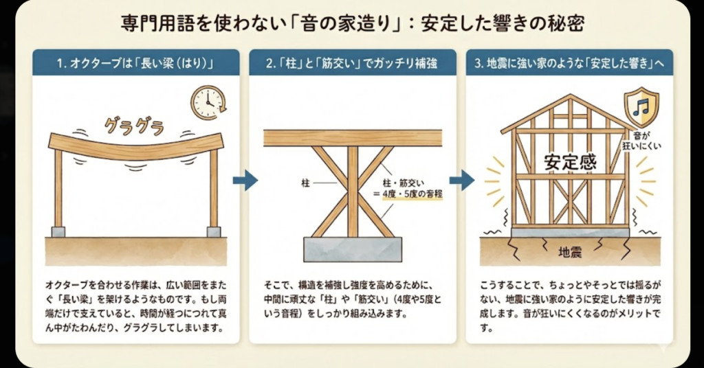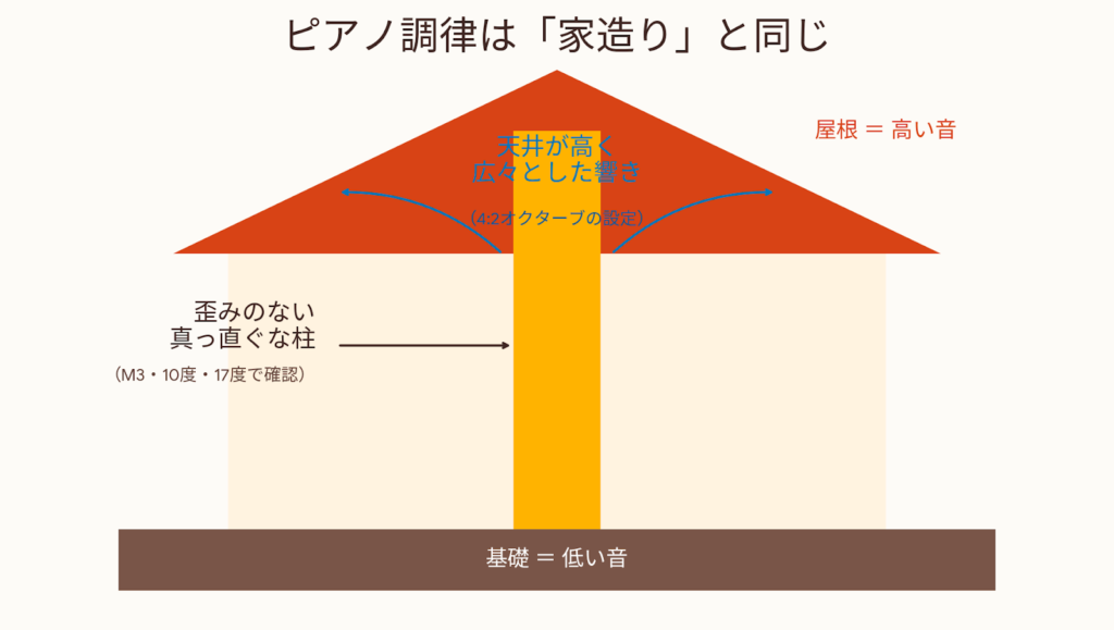 現代の音楽の99%以上は「平均律」というルールで作られています。 私たちの脳にとって、平均律はいわば言葉の「あいうえお」。音が狂ったピアノは、その発音がズレている状態と同じです。脳が「正しい」と認識する基準から外れると、音楽の心地よさは無意識のうちに損なわれてしまいます。