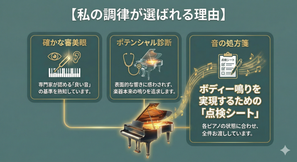 まずは調律という「スタートライン」へ。あなたのピアノの本当の声を、一緒に聴いてみましょう。🎹