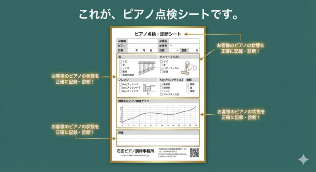 ピアノの健康状態を知り、本来の輝きを引き出すための大切なステップです。