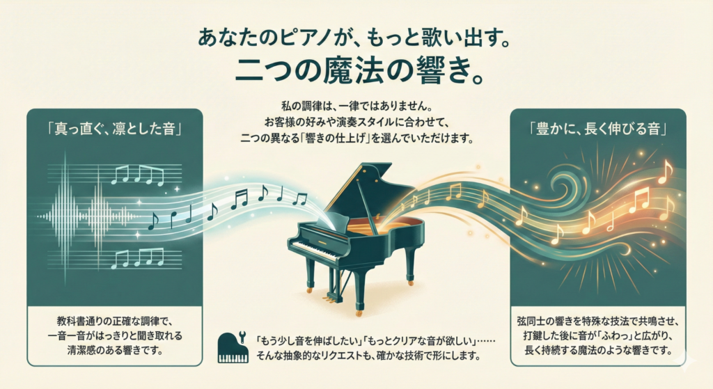 「あなたのピアノも、私の調律で『歌うピアノ』にしてみませんか?」 ピアノの状態に合わせ、最適なプランをご提案いたします。ぜひお気軽にお問い合わせください。