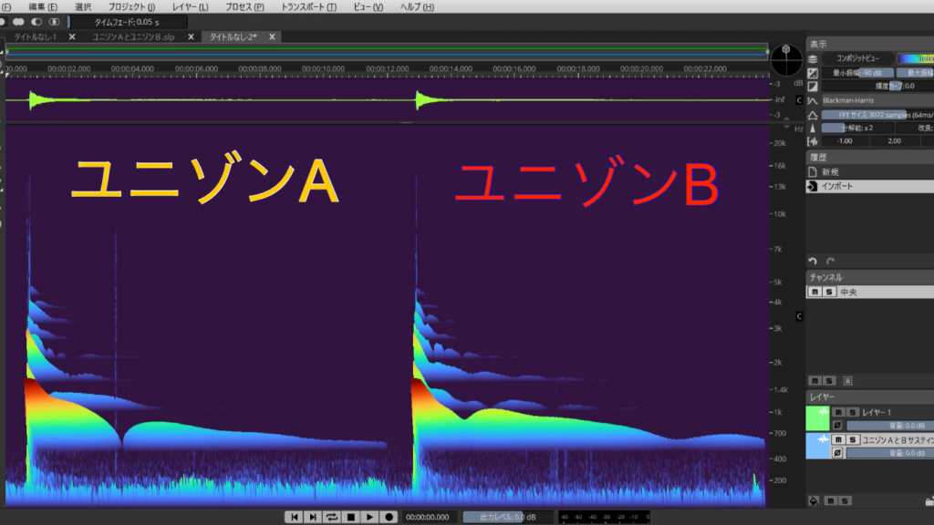 ↑この画像は私が2通りの方法で調律した、ピアノの中央付近の“ド”の音を周波数解析ソフトでビジュアル化した画像です。