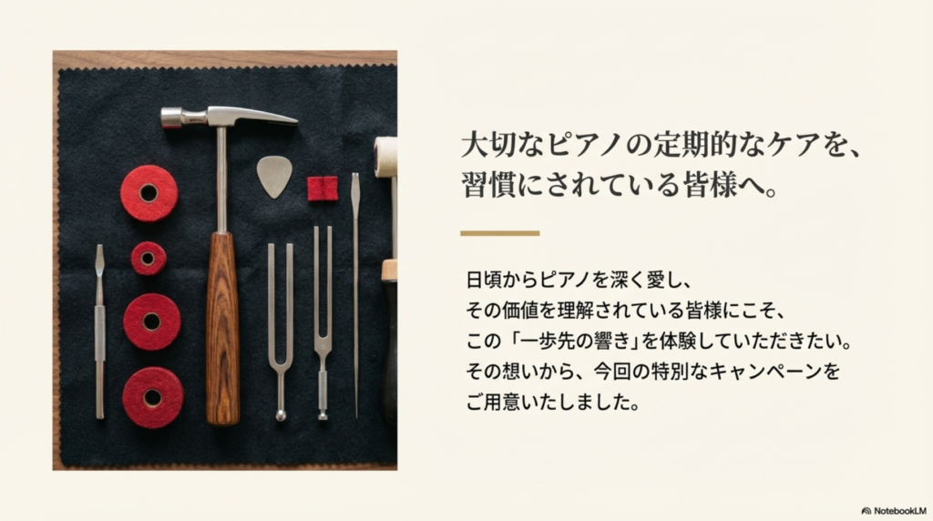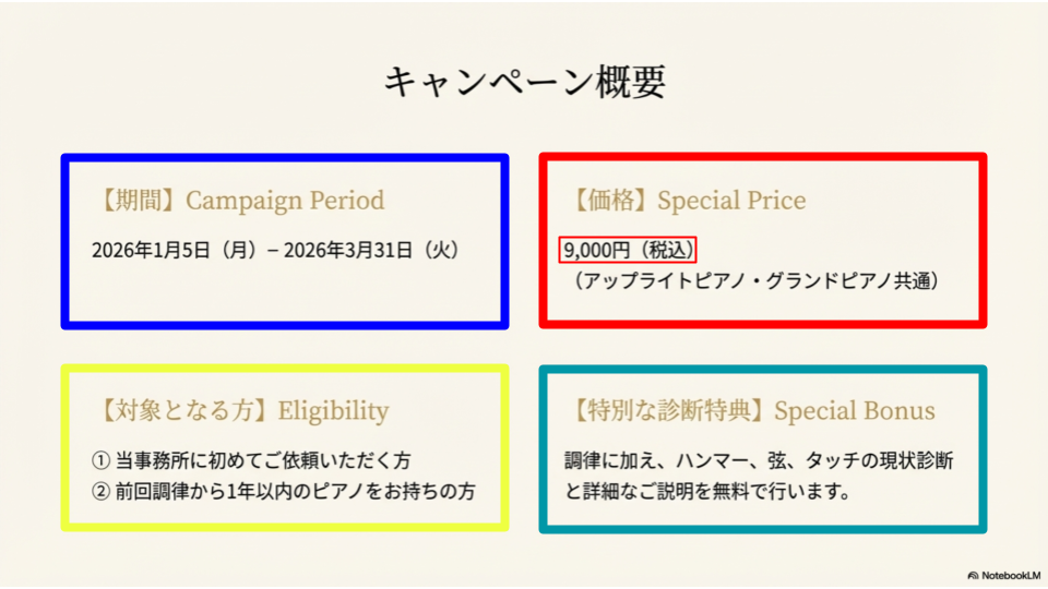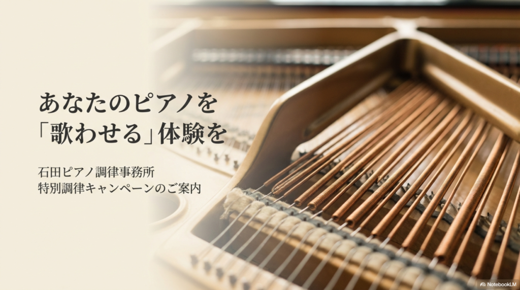 ピアノ調律師乗り換えキャンペーン 2026 1/13 ピアノ調律 新規の方限定キャンペーン 2026年1月13日 目次ピアノ調律師乗り換えキャンペーンのご案内 ピアノ調律 新規の方限定キャンペーン よかったらシェアしてね! URLをコピーしました! URLをコピーしました! 漫画版ホームページ この記事を書いた人 pianomocha 関連記事 家族のピアノがいつでも美しく響くように、調律のご提案 2025年8月16日 子供さんがピアノを習われているみなさんへ、調律のご提案 2025年8月16日 ピアノの先生方へ石田ピアノ調律事務所からのご提案 2025年8月16日 大人になってピアノレッスンを再開されたあなたへ、ピアノ調律のご提案 2025年8月16日 調律を担当したお客様が世界でご活躍中です 2025年6月5日 ピアノ調律師のぼくにできること 2024年11月10日 ヤマハピアノをお持ちの方へ 2024年5月10日 ピアノ調律料金表 2024年1月15日 コメント コメントする コメントをキャンセルコメント ※ 名前 ※ メール ※ サイト 次回のコメントで使用するためブラウザーに自分の名前、メールアドレス、サイトを保存する。 Δ