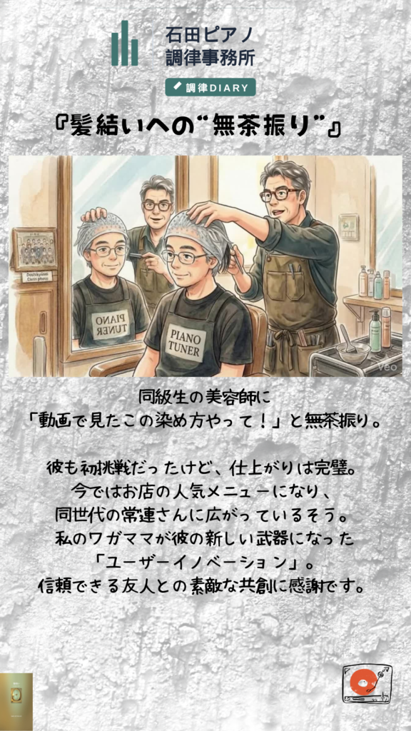 『髪結いへの無茶振り』 2026 3/19 未分類 2026年3月19日 未分類 よかったらシェアしてね! URLをコピーしました! URLをコピーしました! ピアノのお手入れ 『らじるらじる 久末航ピアノ凱旋リサイタル』 この記事を書いた人 pianomocha 関連記事 漫画版ホームページ 2025年12月22日 ヤマハをスタインウェイみたいに…『OVERTONE BRIDGE』のご紹介 2025年8月2日 グランドピアノフレンジトルク適正値(ピアノ調律師用) 2025年6月14日 クラリネット&ピアノミニコンサートのご案内 2025年4月28日 母校 草津東高校での『ピアノ調律体験』を開催してきました。 2024年1月15日 保護中: 高校生のハローワーク『ピアノ調律体験とピアノコンサート』主催:日本ピアノ調律師協会 2024年1月15日 保護中: グランドピアノ譲渡希望のご案内 2024年1月9日 ピアノオーバーホール“ピアノの音に影響する重要な3パーツ” 2022年2月11日 コメント コメントする コメントをキャンセルコメント ※ 名前 ※ メール ※ サイト 次回のコメントで使用するためブラウザーに自分の名前、メールアドレス、サイトを保存する。 Δ